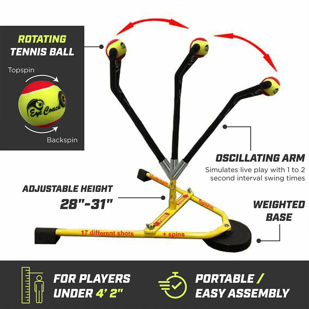 Designed and endorsed by Billie Jean King, the Eye Coach® is the only revolutionary device that retrains the brain to consistently hit the Sweet Spot. The Eye Coach simulates an actual game with 17 different shots, including top spin and underspin. The Eye Coach is also a portable and affordable an alternative to the traditional ball machine as it can be used at home with no court required. The Eye Coach Junior model is design for players shorter than 4 foot, 2 inches. The size variation between Pro and Junior allows players to make contact with the ball just below the shoulders.