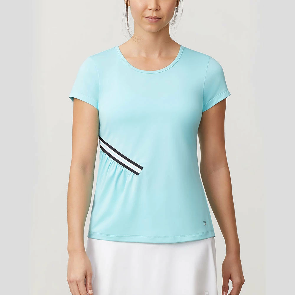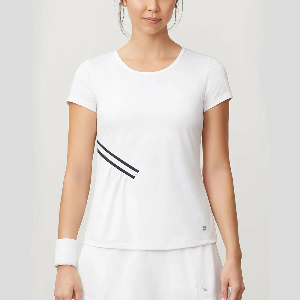 The Fila Love Game collection features warm-weather inspired colors and performance fabrics to enhance your style and experience on the court. The Love Game Short Sleeve Top includes ultra-trendy style elements that are sure to turn heads at the tennis club. This performance top features a delicate shirring detail with contrast color taping at one side.