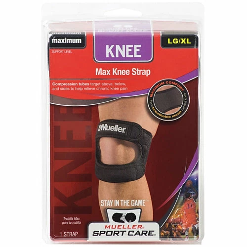 The Mueller Max Knee Strap is built with compression tubes that target above, below and the sides of the knee to help relieve chronic pain. Youll get lightweight, targeted compression without reducing your mobility. Breathable mesh fabric delivers a comfortable fit and smooth feel.