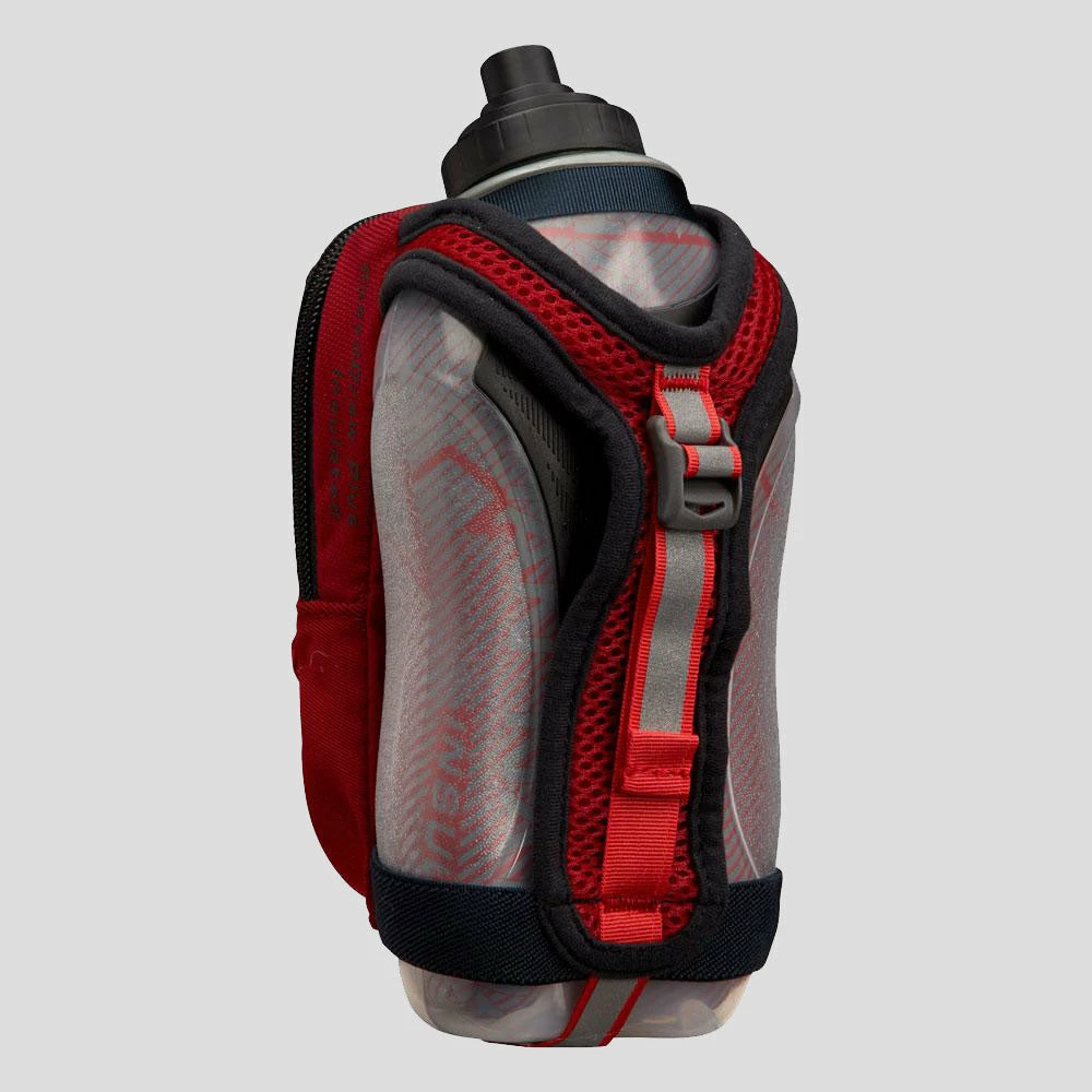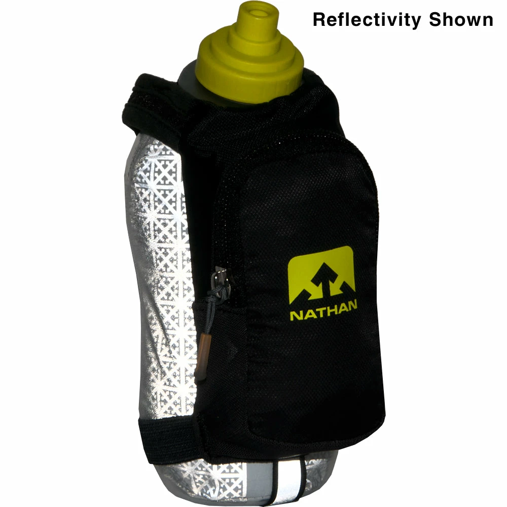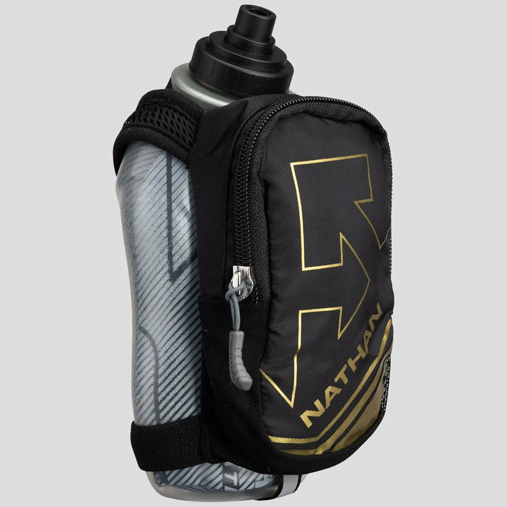The Ergonomicalâ„¢ Nathan SpeedDraw Plus Insulated 18 oz Flask allows for the most natural grip possible and easy-squeeze access to hydration. The insulation makes this the first-ever double-wall flask and will help keep your liquids cooler for much longer. A fully adjustable hand strap with thumbhole enables grip-free running.
