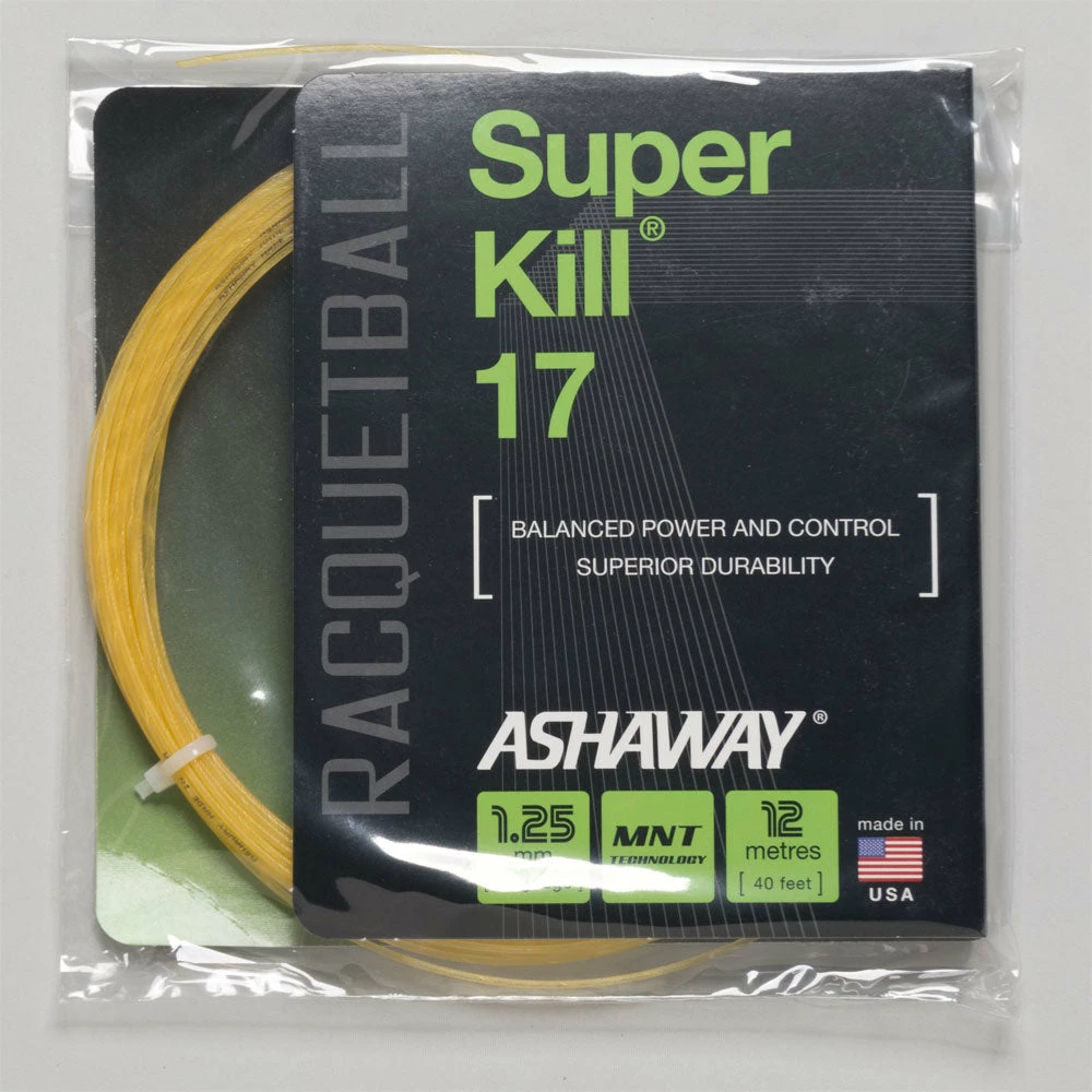 For balanced power and control, string your racquetball racquet with Ashaway Superkill 17. This multi-stranded string features a monofilament construction, high-tenacity, and an abrasion-resistant wear surface. Perfect for players looking for more playability from a thinner SuperKill string.