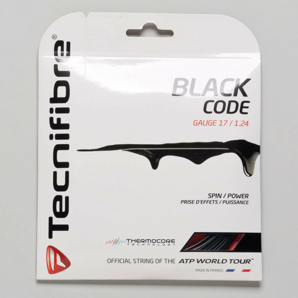 Polyester. Black Code from Tecnifibre is a high quality copolymer monofilament polyester string with ThermoCORE technology for outstanding flexibility with the ultimate durability and spin potential.