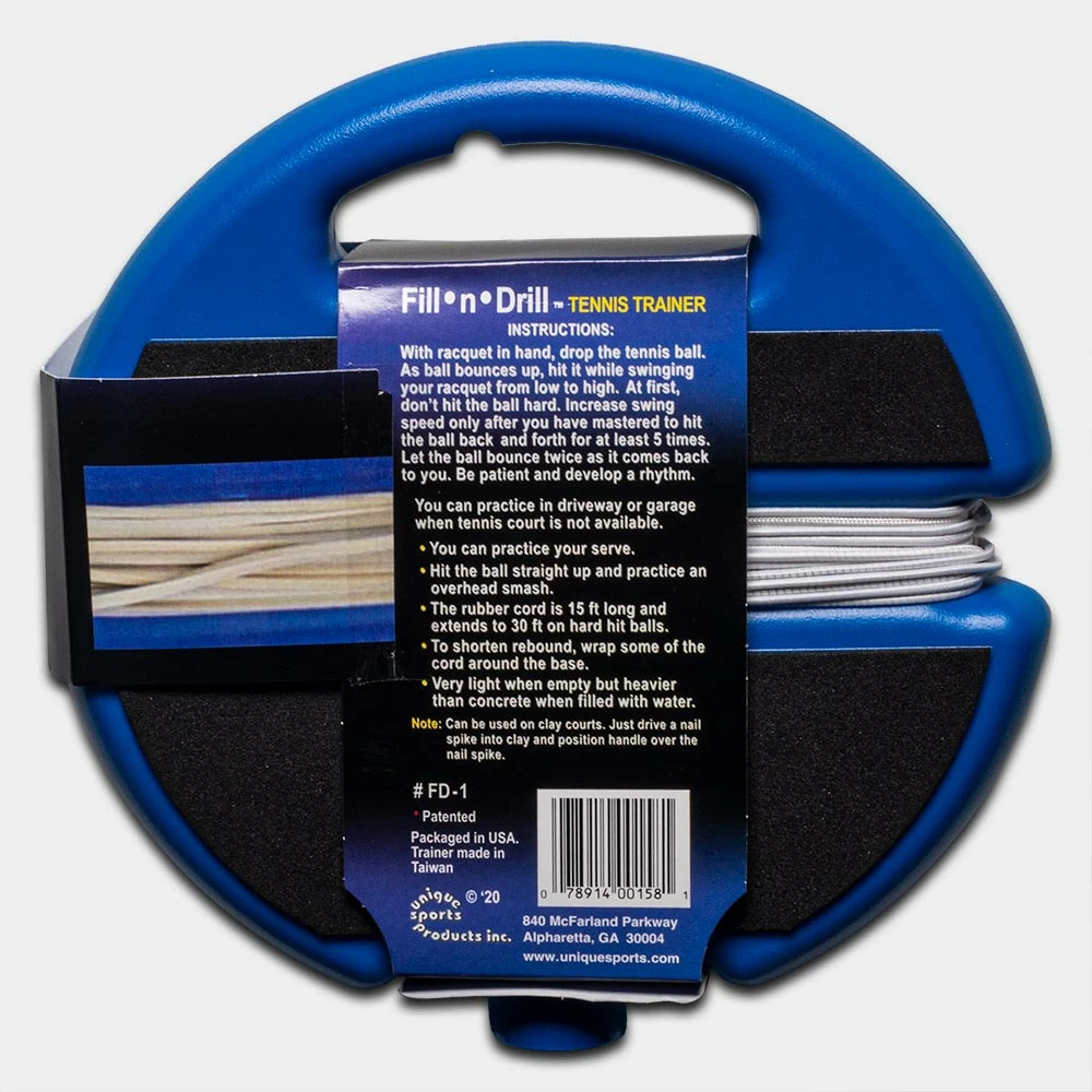 No practice partner? No open tennis court? No problem! Practice your forehand, backhand, serve and overhead smash by yourself with the Fill N Drillâ„¢ Tennis Trainer from Unique. Use it in a tennis court, driveway or garage.